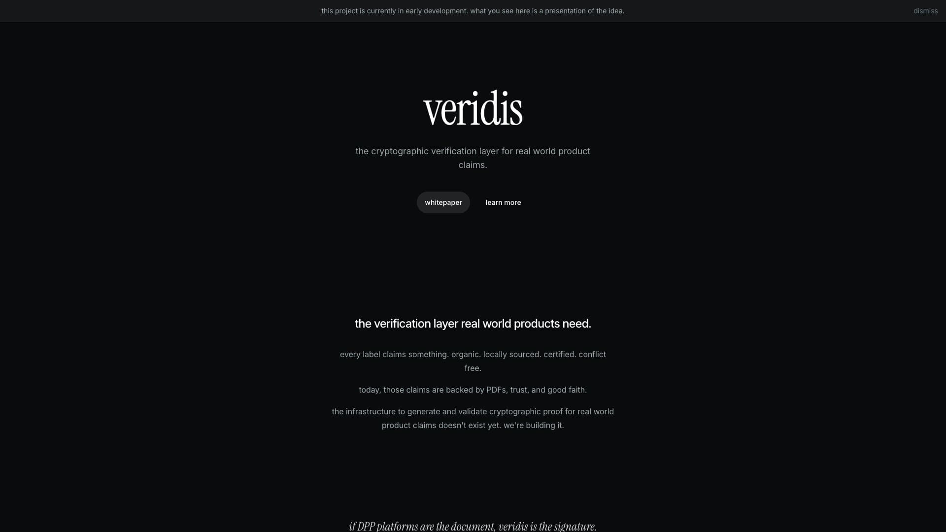 veridis changes that. if DPP platforms are the document, veridis is the signature: a verification layer that turns unsubstantiated claims into cryptographically provable facts.